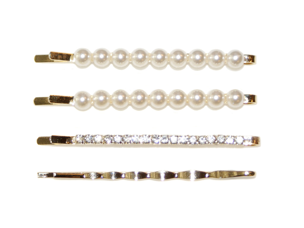 A set of four beautiful and versatile 7cm long slides, one pair featuring pearls, one slide featuring sparkling diamantes and one scalloped plain slide in gold.